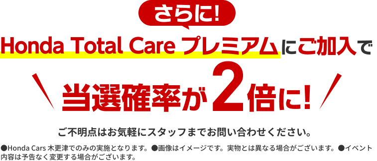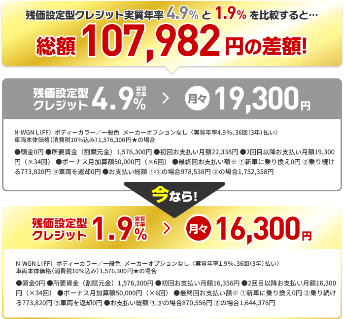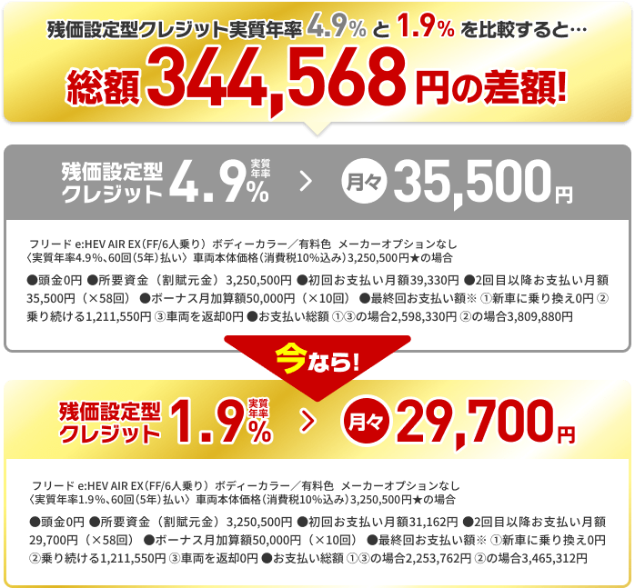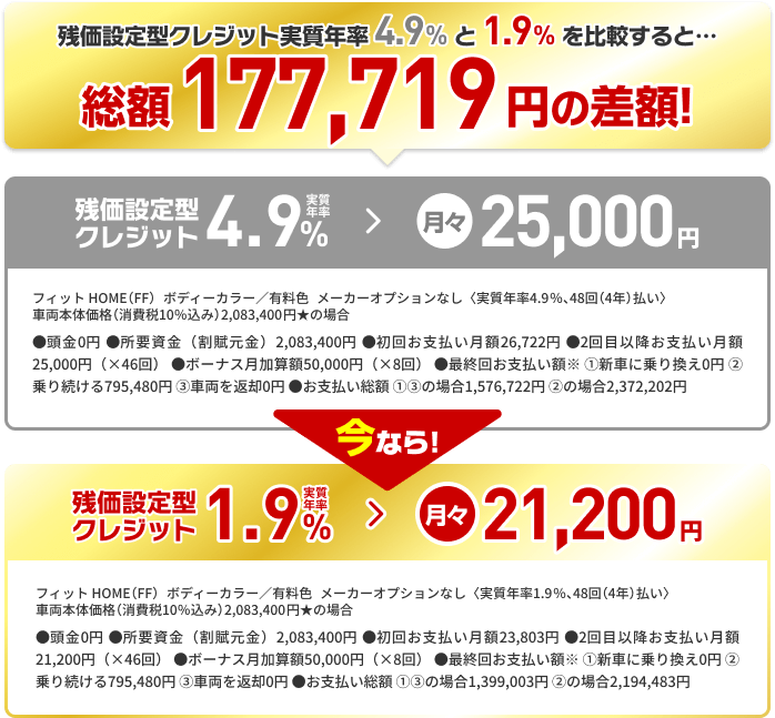 【残価設定型クレジットのお支払い例について】上記お支払い例は2026年1月の一例です。上記お支払い例は、初回お支払い月を2026年3月、初回ボーナス月を2026年7月(以下ボーナス月は1月・7月)で計算した一例です(ボーナス月は設定がある車両に限る)。※本クレジットは最終回に、@新車に乗り換え、A乗り続ける(最終回お支払い額を一括または再クレジットでお支払い)、B車両を返却 のいずれかをお選びいただけます。@、Bの場合、内外装キズや走行距離などの確認事項があります。事前に定めた条件を超える場合には、その差額分を別途ご負担いただきます。詳しくは営業スタッフまでお問合せください。